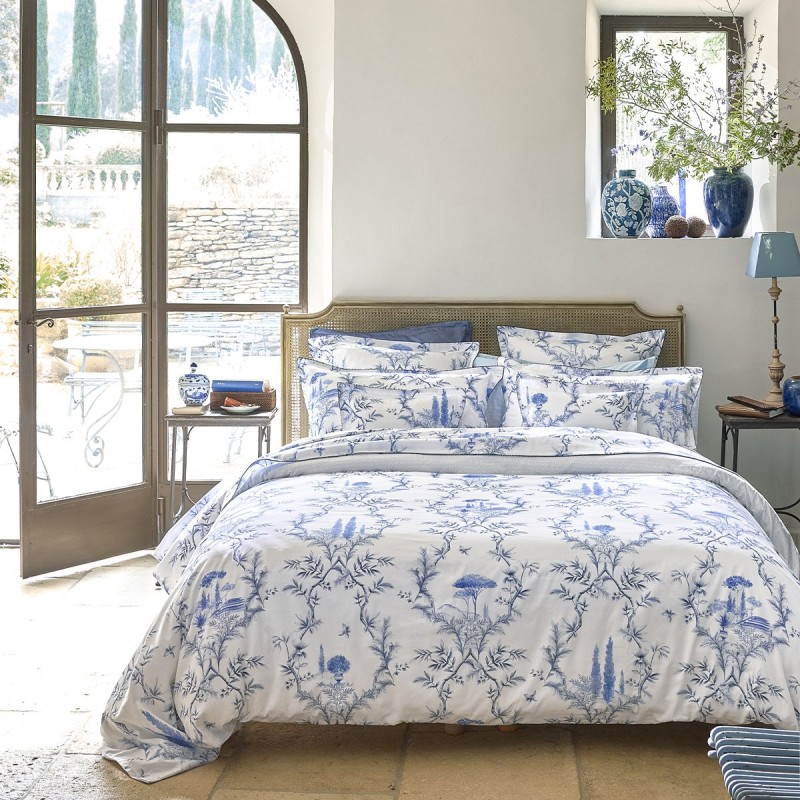 La parure de lit Luberon s’inspire des paysages provençaux, mêlant tradition et modernité avec des motifs classiques et des dégradés de bleus. Le revers uni subtil, modernisant l’ensemble avec élégance. Ce modèle luxueux est travaillé sur un satin de coton imprimé, 100% coton Bio longues fibres 120 fils/cm². Alexandre Turpault.