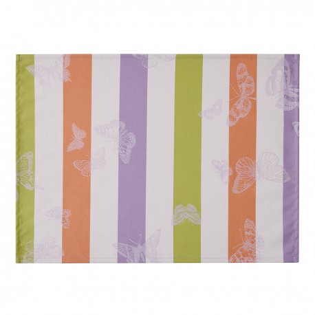 Magie d'un instant féerique au coeur d'un jardin enchanté où les papillons virevoltent avec grâce, associée à un jeu de rayures polychromes audacieux d'une simplicité trompeuse. Sets de table en coton enduit de haute qualité, traités anti-taches, anti-glisse. Vendus par 4. Fabriqués en France. Le Jacquard Français.