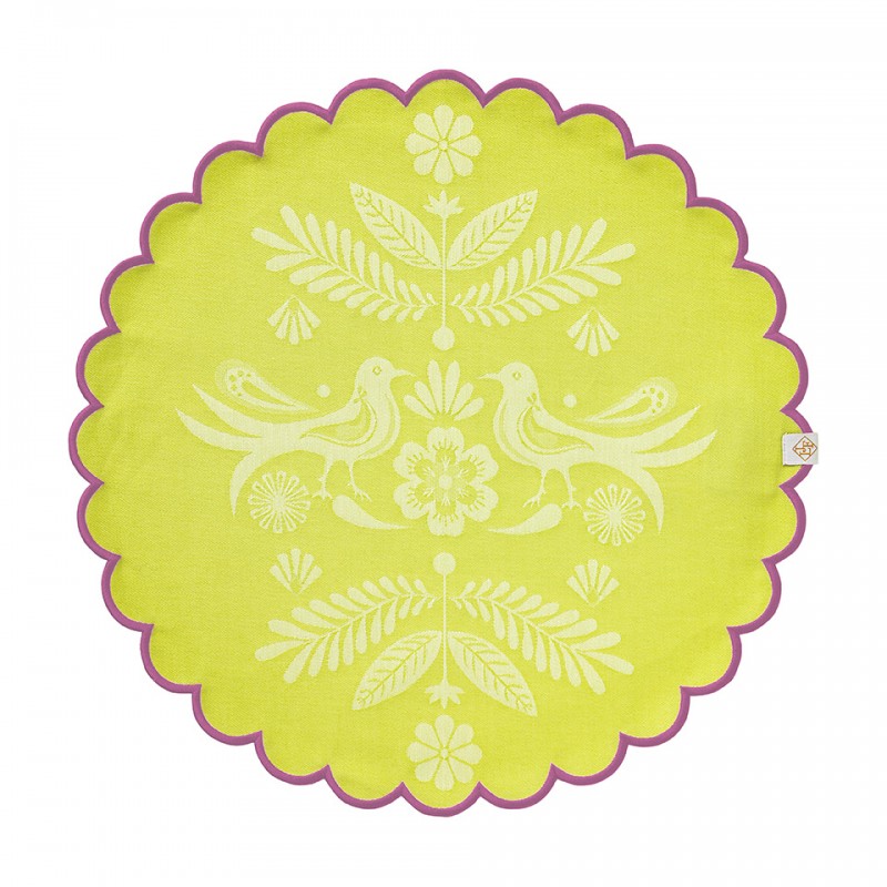 Inspirés par la magie des broderies de Tenango au Mexique, les motifs de ce modèle se réinventent à chaque regard. Plumes, fleurs, feuilles et oiseaux s'entrelacent sur des fonds éclatants et chaque pièce est soulignée d'un feston contrasté, diffusant un souffle de couleurs vives qui éveillent les sens et invitent au rêve. Sets de table ronds design en coton enduit de haute qualité, imperméable, traité antitaches, anti-glisse. Vendus par 4. Fabriqués en France. Le Jacquard Français.