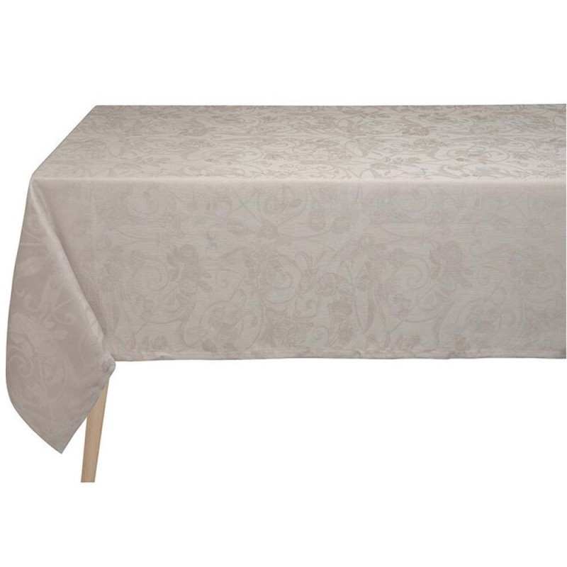 Tivoli, un modèle chic et intemporel, qui traverse le temps ! Des motifs voluptueux d'entrelacs, volutes et végétaux, parent ce superbe uni damassé pur lin, coloris sable. Nappe sur mesure de forme rectangulaire, carrée, ronde ou ovale. Laize 180cm. Repassage facile. Tissé en France. Le Jacquard Français.
