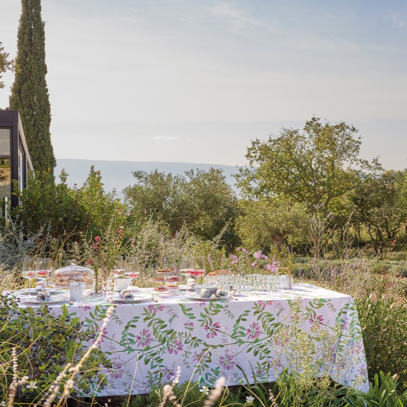 . La collection Pois de senteur, se décline en nappe carrée ou rectangulaire, serviettes de table, chemin de table... en vente sur Comptoir du Sud.