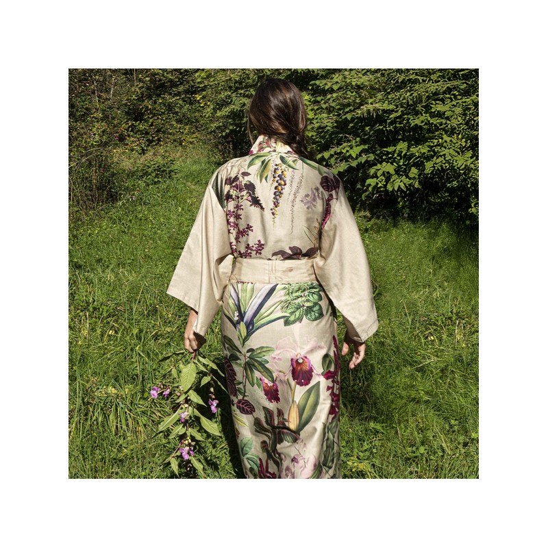 Kimono long imprimé en satin de coton 120 fils/cm² Parfum d'Orchidée Grège, Garnier-Thiébaut