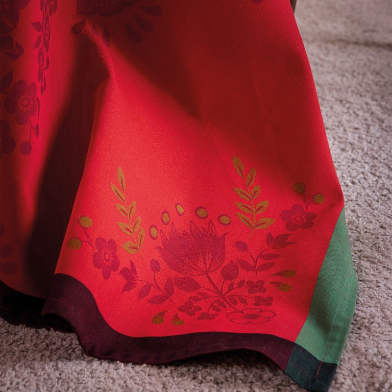 En édition limitée, dans un traditionnel rouge, c'est le petit carré déco de Noël qui nous invite autour d'une table de fêtes de Noël et fin d'année. Travaillé sur un damassé 100% coton peigné longues fibres, 205g/m². Finition soignée coins capuchons. Tissé en France. Le Jacquard Français.