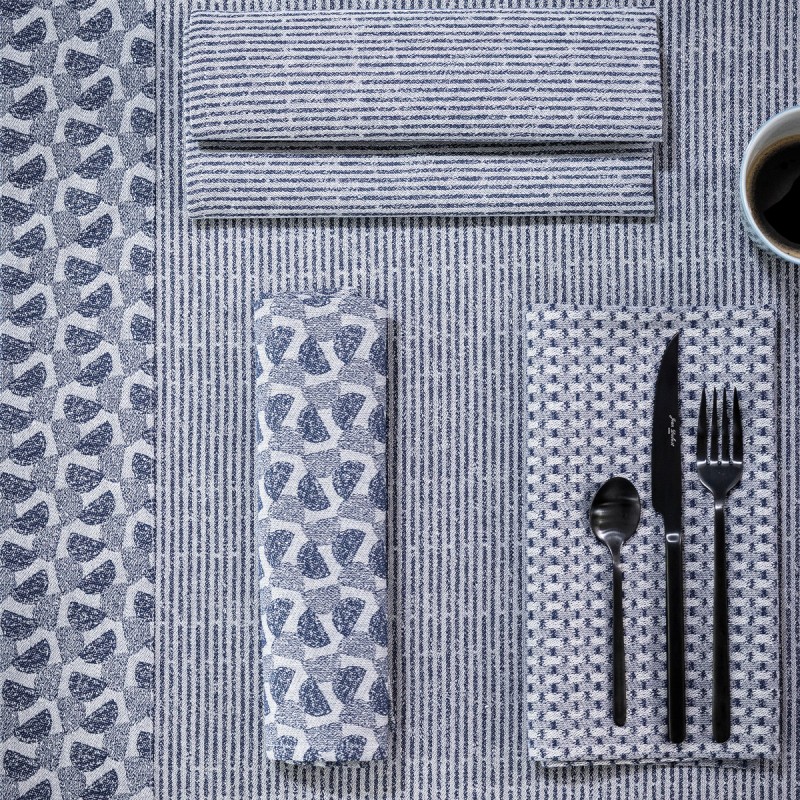 Trouvez votre style, mixez les serviettes de table Empreintes Pois, Rayures et Tissage avec vos sets de table enduits et nappes Empreintes !