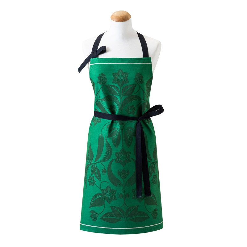Tablier de cuisine Piment Vert. Une collection aux couleurs épicées, un véritable tableau botanique et éternel aux saveurs enflammées et aux allures inspirées de l'Art Nouveau. Avec sa coupe élégante et féminine, ce tablier champêtre reflète le tout savoir faire du Jacquard Français. Tissé en pur coton. Fabriqué en France dans les Vosges.