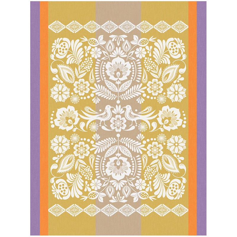 Inspirés des broderies de Tenango au Mexique, plumes, fleurs et oiseaux s'entrelacent sur des couleurs éclatantes qui éveillent les sens et invitent au rêve. Torchons de cuisine de haute qualité, en damassé 100 % coton absorbant. Tissés en France. Vendu par 4. Le Jacquard Français.